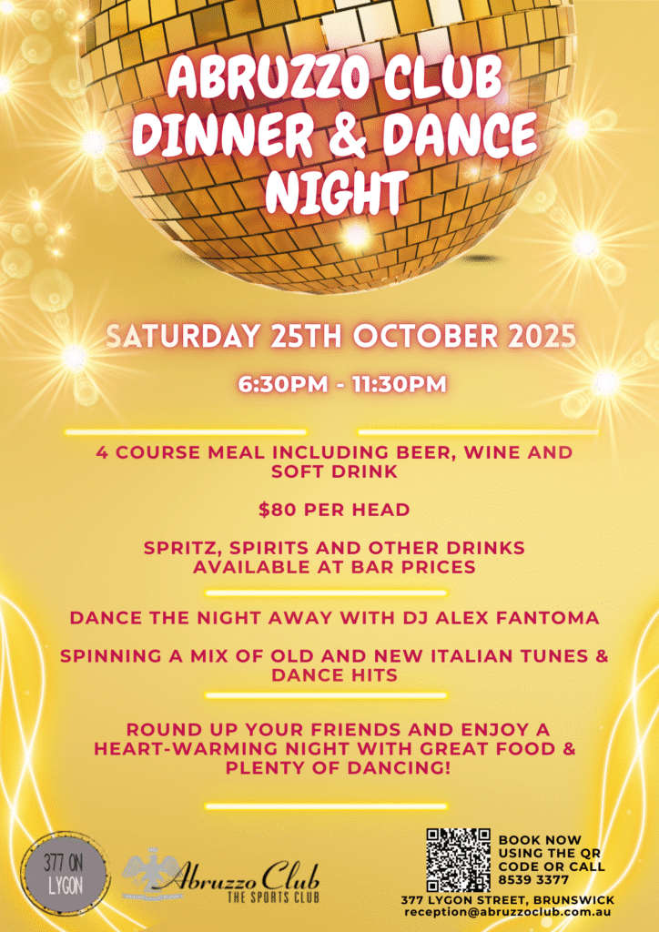 Our 2025 upcoming events Our Club has many Special events throughout the year, feel free to ring us for booking and enquiries.CHECK OUT OUR 2025 EVENTS BELOW Ladies Lunch Every Second Thursday of the monthBookings essential – 03 8539 3377 Spaghettata Every Third Thursday of the month Bookings Essential 03 8539 3377 Intimate Performance with Piero Piero is performing on the Friday 31stOctober in our Restaurant 377onlygon Bookings Essential 03 8539 3377 Dinner & dance Night Saturday 25th October 2025 at 6:30pmBookings Essential 03 8539 3377 Book Now Anniversary Dinner Saturday 8th November 2025 at 6:30pmBookings Essential 03 8539 3377 Seafood Night Friday 28th November 2025 at 6:30pmBookings Essential 03 8539 3377